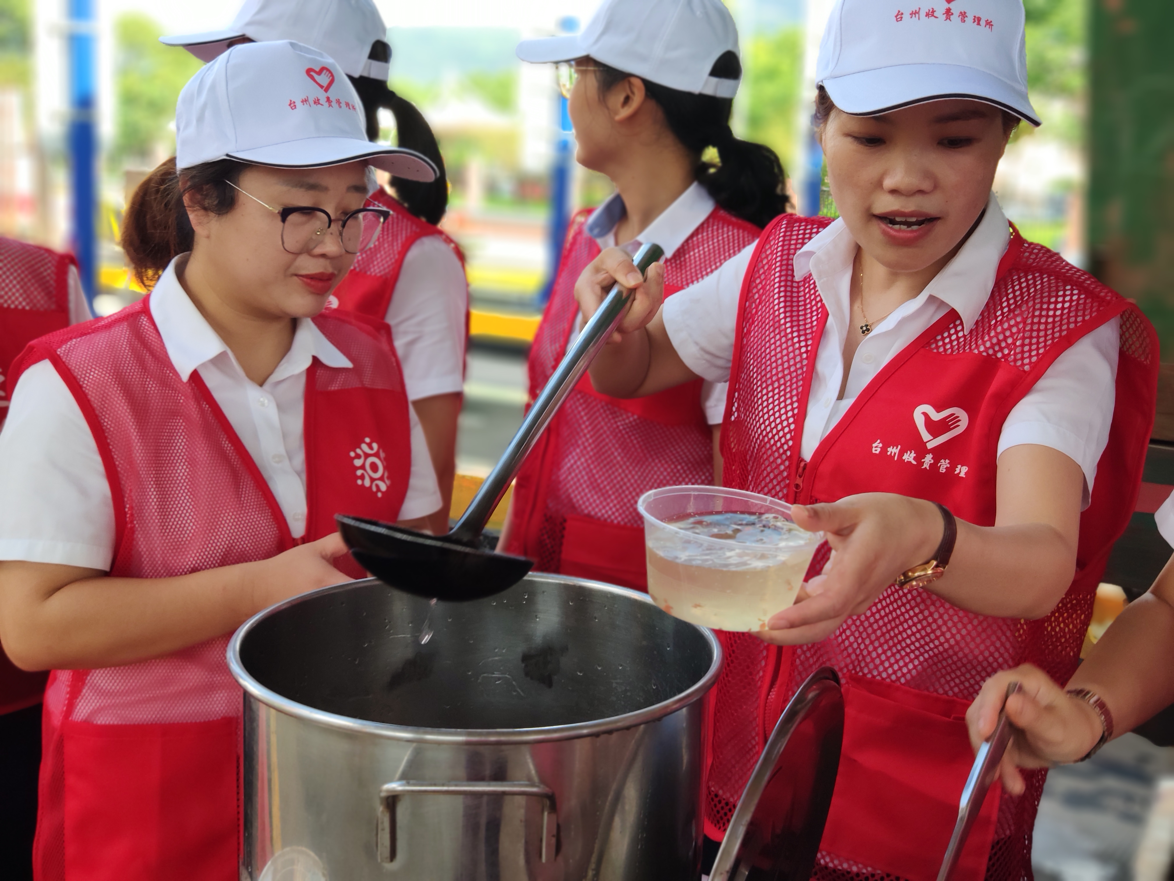 圖為志愿者合影 上午9點,志愿者們身著統一紅馬甲,在崗亭的安全島上設立服務臺,抬出食堂提前制作好的青草糊、綠豆湯等清涼飲品。你來分杯我來送,大家不亦樂乎開始了送清涼活動。