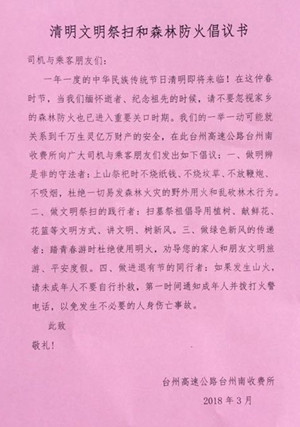 圖為倡議書 為增強防火意識,做到文明祭掃,3月16日上午,臺州南收費所在向過往司乘人員發(fā)放《清明文明祭掃和森林防火倡議書》,倡議大家做明辨是非的守法者:不燒紙錢、不放鞭炮、杜絕野外用火和亂伐林木行為;做文明祭掃的踐行者:提倡用植樹、獻鮮花、花籃等方式祭祖;做綠色新風(fēng)的傳遞者:勸導(dǎo)家人和朋友文明出游;做進退有節(jié)的同行者:發(fā)生山火,理智救火。