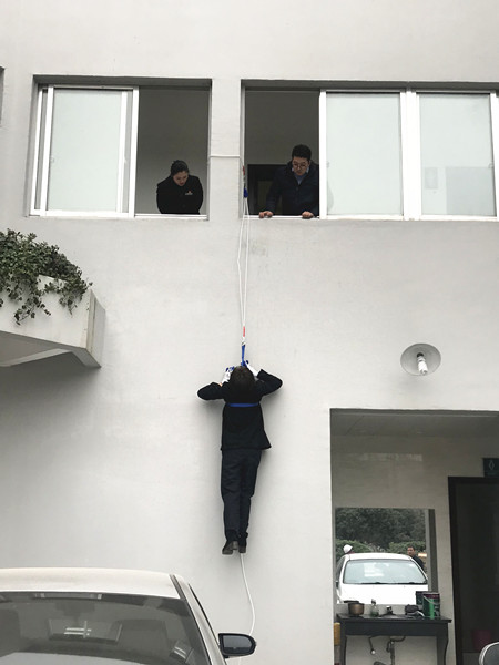 圖為高處逃生演練現場 理論培訓結束后,溫嶺西收費所隨即開展實地逃生演練,讓員工學習使用逃生繩從高處逃生的技能。在蔡教官的指導下,一名收費員大膽地自我推薦,主動嘗試此自救方法。 一切準備就緒,該收費員迅速爬上窗戶,利用逃生繩小心地沿著墻壁下滑,并順利落地。教官最后根據演練情況作點評。 此項技能有助于在火災時多開辟一條逃生通道,減少人員傷亡。 通過此次全面的培訓演練,溫嶺西收費所將全力共抓消防安全工作,排除各類隱患。 鄭霞霞