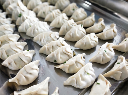 圖為包餃子現場 本次比賽共有五個小組,21人參加,比賽時間為1個小時,各班各自不限男女,由各參賽隊自行選擇餃子餡和調味,由評委根據比賽時間內的餃子數量、外觀及口感進行打分評定。 隨著主裁判史靜宜一聲令下,各組選手拿出領到的餃子皮和餃子餡,開始麻利地忙活起來。比賽過程中,笑聲、喝彩聲不斷,組員之間分工協作,一排排獨具個性的餃子很快就擺滿了一個個盤子。桌子上的餃子,雖然有大有小,有扁有圓,但每個人臉上都洋溢笑容。