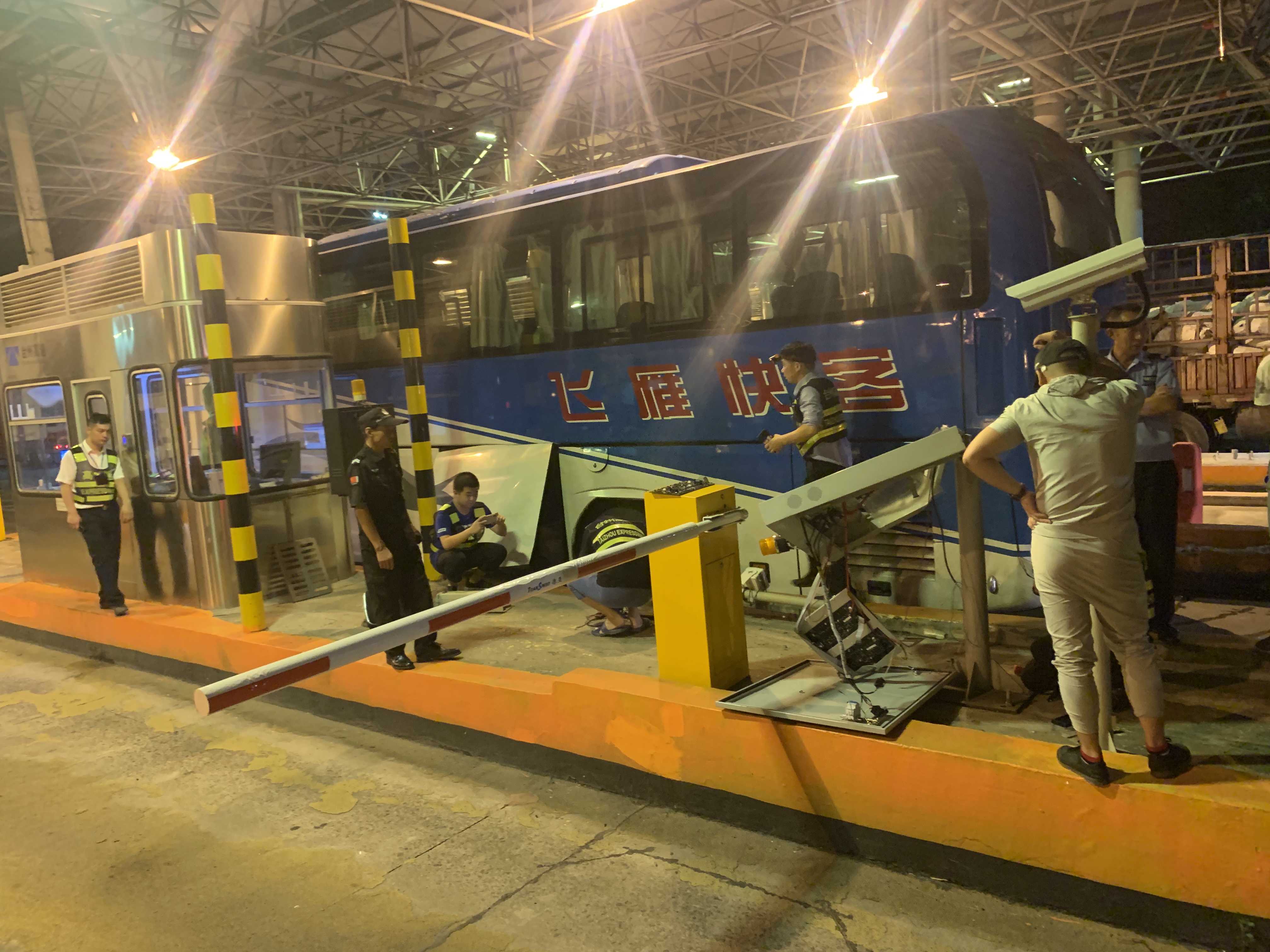 圖為事故處置現(xiàn)場 當(dāng)晚,收費(fèi)員蔣弓在進(jìn)口車道突然聽到一聲巨響,發(fā)現(xiàn)一輛客車裝行李的側(cè)門撞到ETC設(shè)備,且損壞情況非常嚴(yán)重。因為大客車堵塞車道,后面的司機(jī)不明情況排起了車隊。班長李寧一邊協(xié)同派出所執(zhí)勤點工作人員維持秩序,一邊向監(jiān)控中心匯報現(xiàn)場情況。監(jiān)控中心也馬上聯(lián)系了路產(chǎn)、維養(yǎng)中心、高速交警多個部門。在20分鐘內(nèi)所有部門陸陸續(xù)續(xù)趕到現(xiàn)場。為盡快恢復(fù)交通,維養(yǎng)中心同事馬上對損壞ETC設(shè)備進(jìn)行拆卸檢測,路產(chǎn)部門對損壞設(shè)備進(jìn)行定損估價,高速交警勘查現(xiàn)場,拍照取證判定事故責(zé)任,溫嶺西收費(fèi)所工作人員維持進(jìn)口秩序,大家都在高效有序地處理突發(fā)事件。