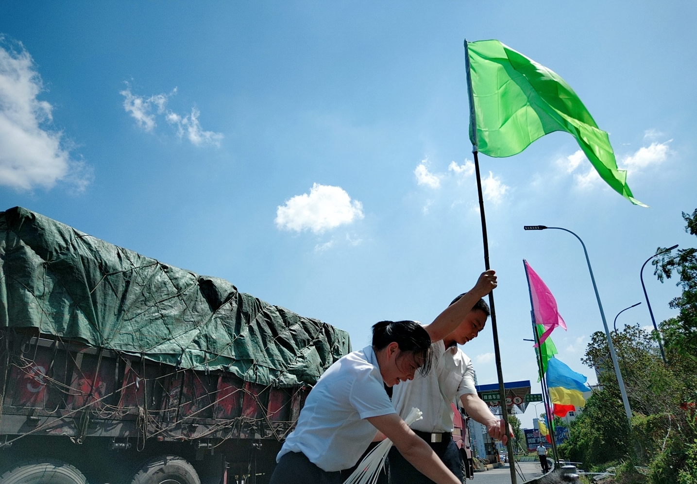 圖為工作人員插彩旗