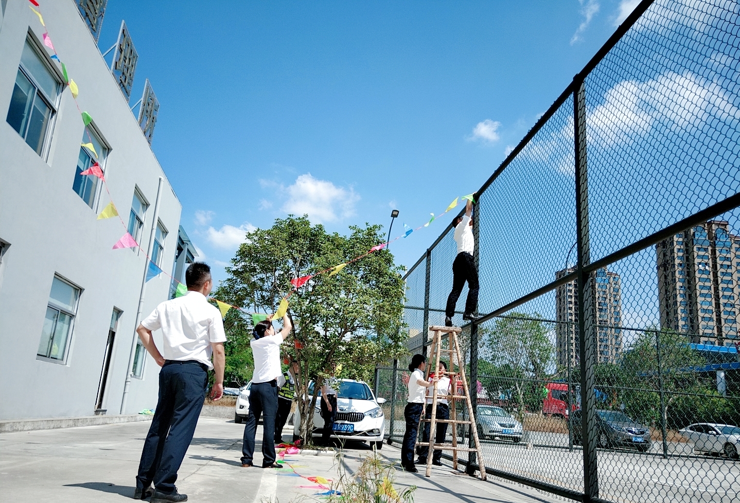 圖為工作人員一起布置收費所 在慶祝祖國70周年生日的日子里,最火的顏色就是紅色。為了弘揚中華民族傳統文化,溫嶺西收費所后勤組早早購置了燈籠、彩旗、五星紅旗,寫好“慶祝祖國70周年華誕”大字等。黨員帶頭,團員緊跟,一線收費員紛紛參與,在收費站大門口、辦公樓、食堂、宿舍等區域精心用五星紅旗、大紅燈籠、五顏六色的彩旗裝點,一抹抹艷麗的國旗紅,成為站點最靚麗的風景。明亮的黃、鮮艷的紅,美麗窗口突然亮了起來,到處洋溢著濃濃的國慶氛圍,為過往司乘提供暢、潔、美的節日行車環境。 溫嶺西收費所后勤組還精心策劃、精細編排,制作了具有特色、獨具創意的生日祝福“小視頻”,祝祖國生日快樂! 通過開展弘揚愛國精神,喜迎國慶活動,溫嶺西收費所全所工作人員更加不忘初心,砥礪前行,共同慶祝祖國70周年華誕。 鄭霞霞