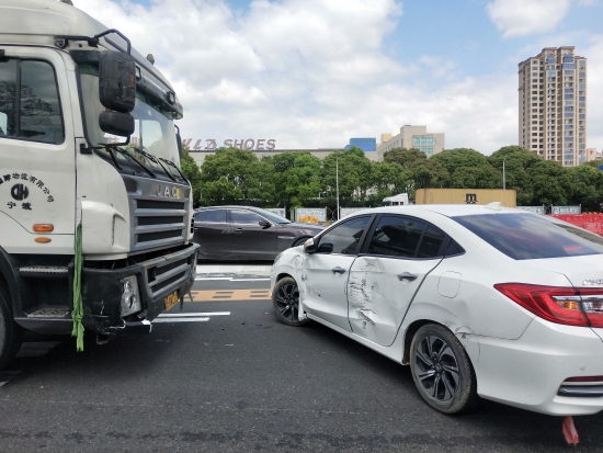 圖為事故現場 聽到巨響,收費員立即上前查看,所幸兩車司機都安好,便立即開啟備用車道,以保證其他車輛通行順暢,并且在事故車輛后方放上小紅帽,告知后方來車及時駛入其他車道。而兩車司機快速撥打交警電話,并且拍照留證,以最快的速度駛出收費站靠邊等待交警處理。 經調取錄像,查看事故緣由。“真相”竟是集裝箱司機引發的,該車從杭州寧波方向過來,小轎車司機從溫州方向匝道駛出,由于集裝箱司機下橋時沒有注意右方來車,只顧自己右拐車道,直接頂著轎車開出50多米,所幸未造成人員傷亡。 在此小編提醒大家:在駛入匝道的時候,司機要減速行駛;在選擇出口車道的時候,要仔細查看前后方和左右來車,且不要突然變更車道,否則容易造成車輛之間的親密“接觸”。 只有文明安全行駛,才是對自己和他人最好的保護。 鄭霞霞