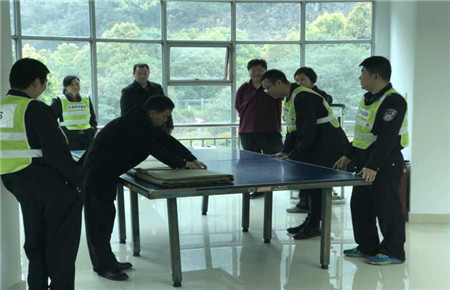 圖為裁判員認真打分 黃土嶺隧道所則組織開展了消防水帶連接使用鋪設訓練。 此次訓練以計時比賽的形式進行,執勤隊員分組展開模擬演練,每組兩次機會,取平均分記入考核。參練人員個個激情高漲,積極投入,演習場面熱鬧非凡。每組隊員在第一輪比賽后都抓緊互相探討動作要領和水帶掐口的連接方法等,確保第二局能夠更準確、更迅速地完成連接。