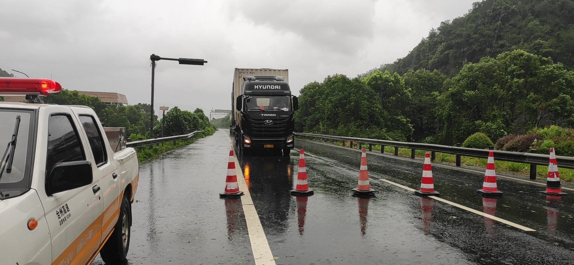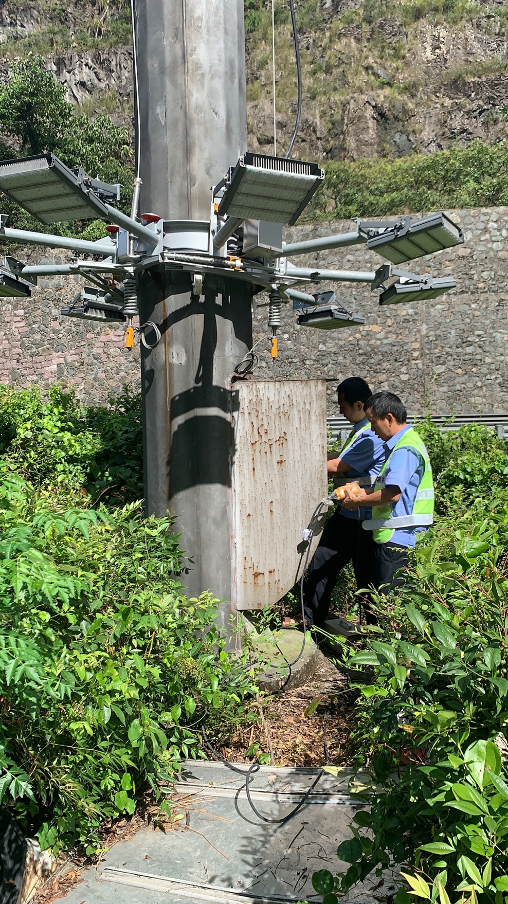 圖為下降高桿燈 03:22分,隧道停電,電工立即去配電房查看并進行搶修。此時風大雨大,估計最大風力11級以上。 03:54分,執勤隊巡查時發現隧道溫向洞口有樹被刮倒,立即冒雨清理被刮的樹木,保障路段暢通。 04:01分,中控走廊的內置下水管溢水,隊員們緊急處理。 07:33分,隧道再次停電,電工又一次來到配電房搶修。 08:12分,接溫州交警通知,受臺風影響,高速上很多車輛發生側翻事故,要求隊員們在溫向隧道口進行封道,隊員們接警后立即在洞口卡口預警。