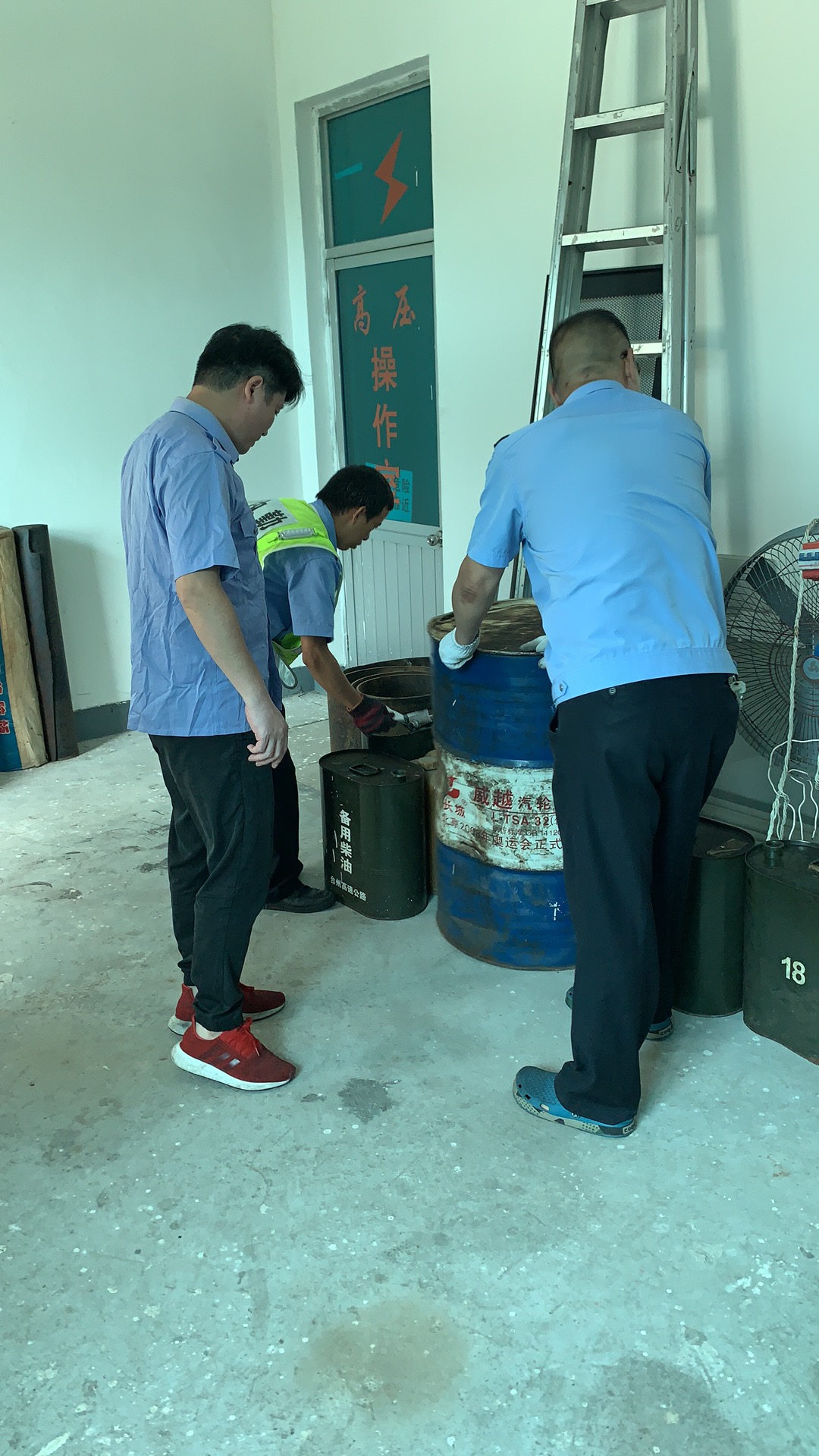 圖為檢查發電機 隨著臺風“黑格比”的臨近,位于臺州和溫州交界的大溪嶺風雨交加,大溪嶺隧道所隊員和值班人員徹夜未眠。 臺風夜,大溪嶺狀況不斷,從19:10分至次日03:15分,共有11輛車在緊急帶出現車輛拋錨現象,中控用廣播呼叫其開走,勸離未果之后,執勤隊出警勸離就達五六次。