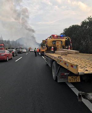 17:40分消防車到達現場滅火,18:15火滅,清障車帶事故車離開現場。從發現到處置完畢僅1小時,無人員傷亡,高速公路也一直保持安全暢通。