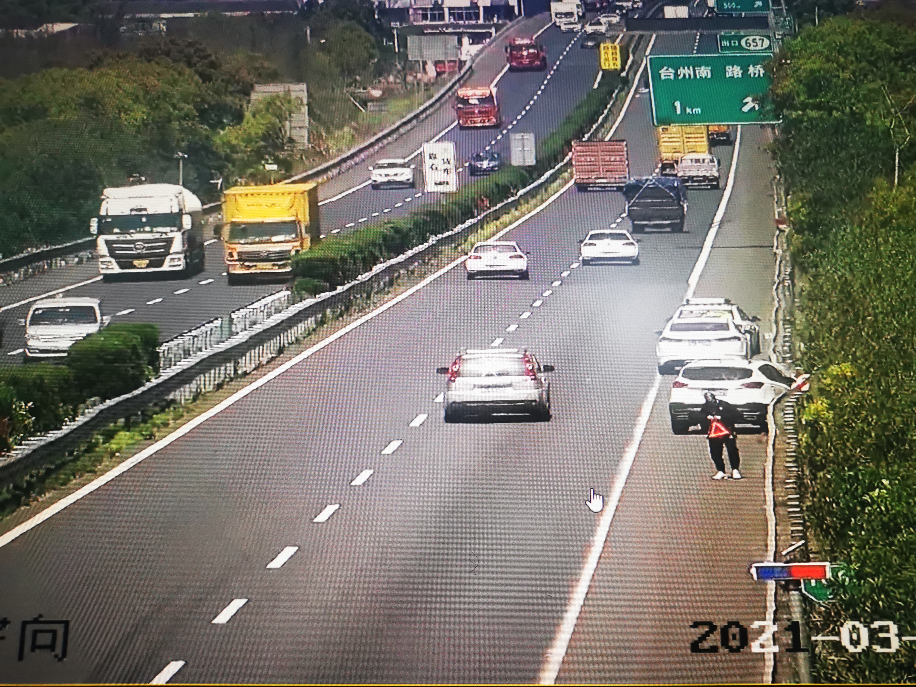 3月25日11點42分,甬臺溫高速臺州一期路段監控中心接過路司機報警電話:寧波方向距離臺州南收費所1公里不到的地方有一輛小轎車撞到護欄看著非常嚴重”。中控員根據過路司機報警描述的位置,迅速查找事故點,隨即通知附近的施救人員