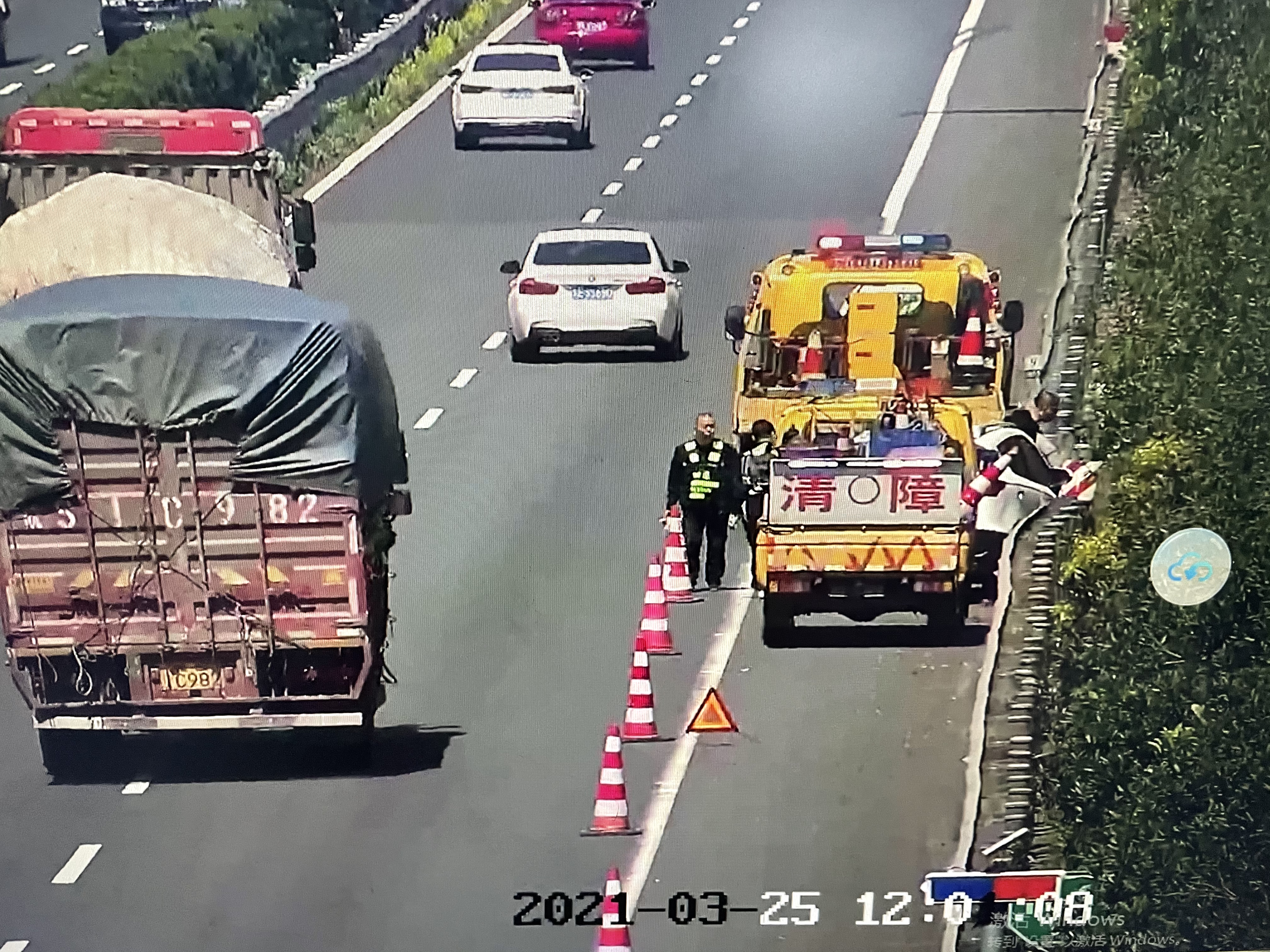這是一起單車撞護欄的交通事故。拉近鏡頭后發現前面有兩輛車停著,是過路熱心的駕駛員在幫司機報警,并在后方擺放了三角警示牌。中控員再次與過路司機聯系詢問駕駛員情況,得知駕駛員因為多次碰撞昏迷,便馬上通知120急救車趕往現場。