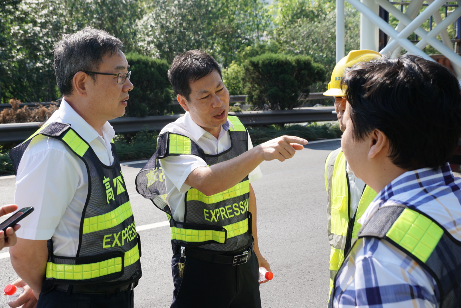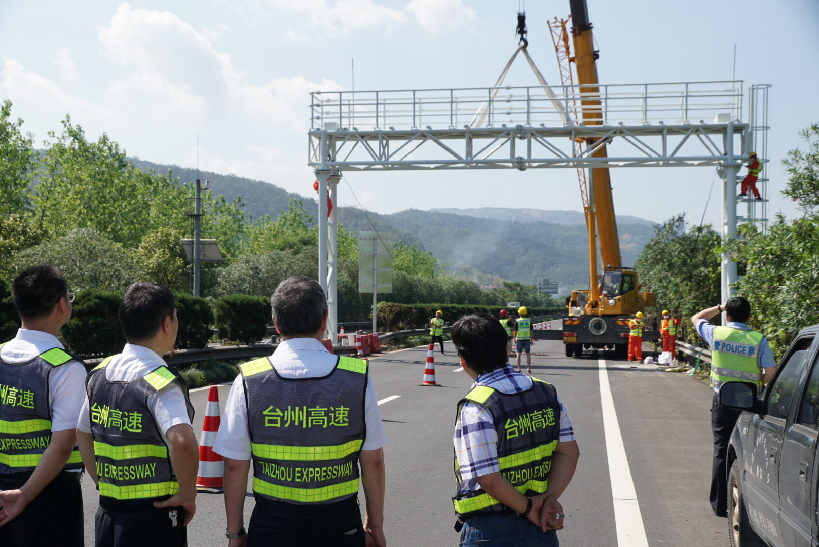 臺州高速完成首個龍門架吊裝 取消省界收費站工作邁出堅實一步 9月7日上午,首個自由流主線虛擬收費站龍門架,在甬臺溫高速公路臺州段溫州方向主線K1668+200M處現場完成吊裝,標志著取消省界收費站工作邁出了堅實的一步。集團董事長、總經理陳文波在吊裝施工現場視察指導工作。集團總工程師江輝,高速交警、施工單位、監理單位、工程部等人員陪同。
