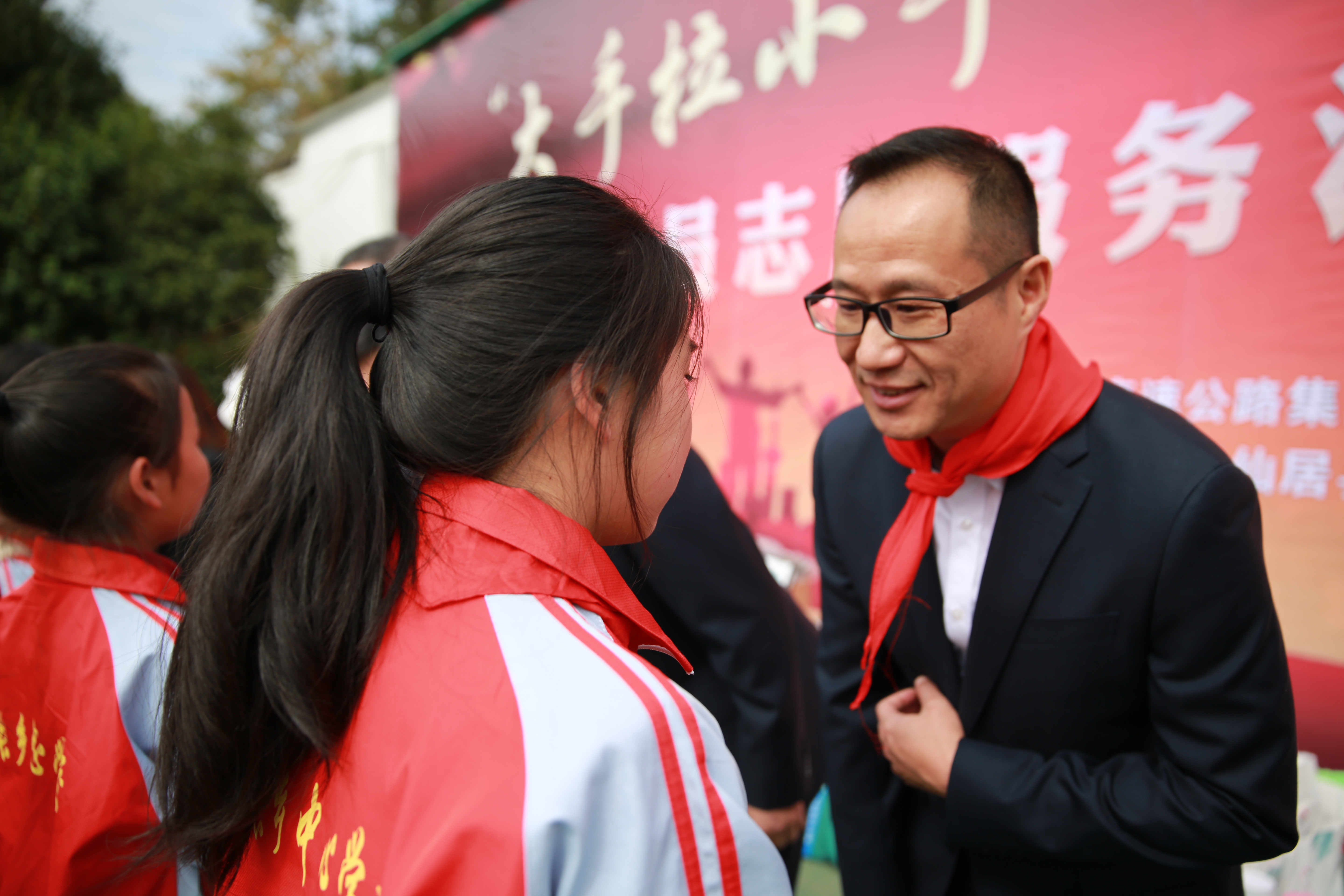 在“點亮微心愿”環節,臺州高速集團領導班子們為學生代表送上新衣服、學習用品等,孩子們則為志愿者叔叔阿姨們系上了在他們眼中最珍貴的紅領巾。