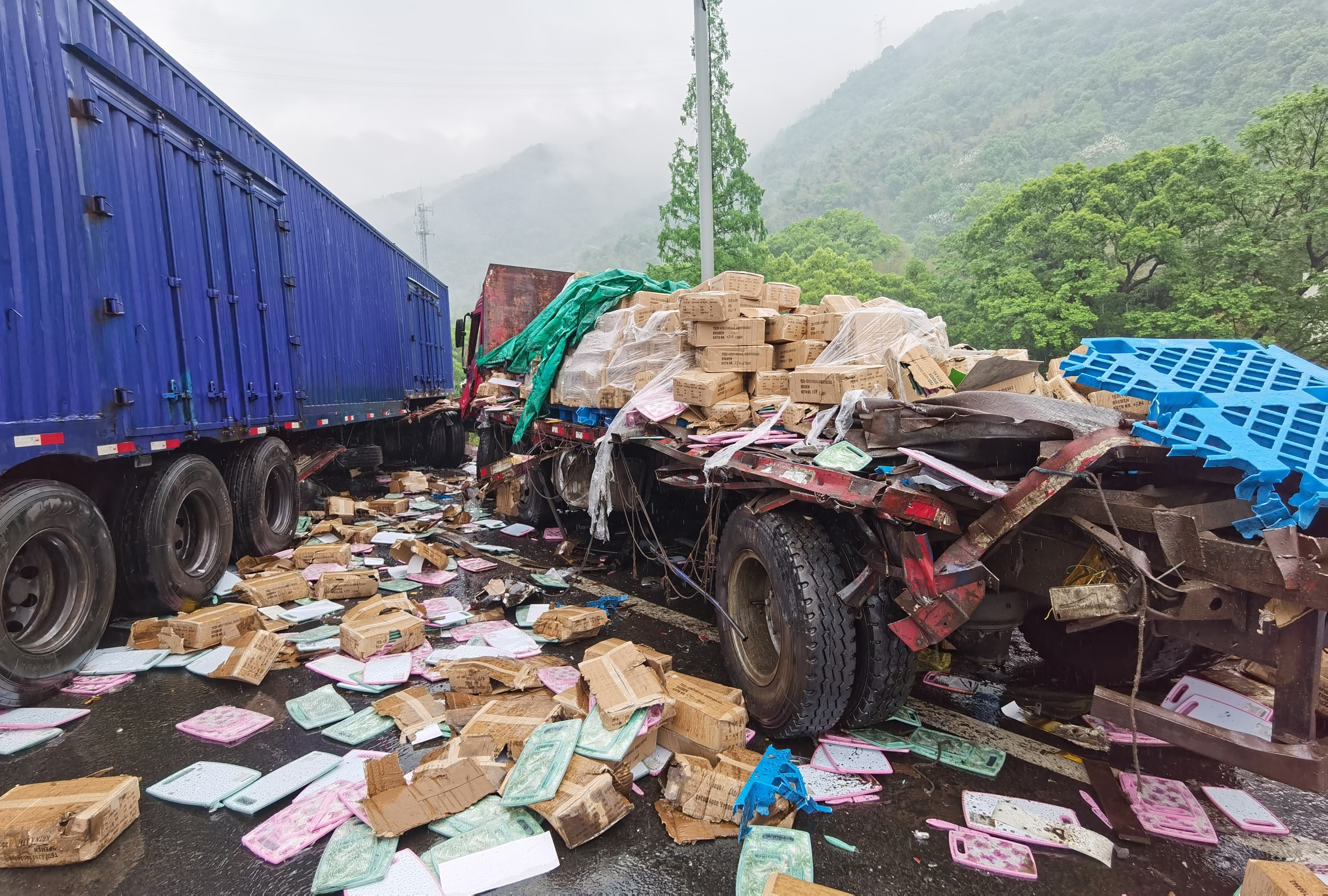 隨后,拖車、救護車、吊車相繼到達,所有人員立即有序分工,因大貨車車頭卡在護欄,需要切割,拖車難度較大需要吊車將其拖出,現場救援緊急開展。隧道所工作人員協(xié)助駁貨車清理貨物和散落的車架,保證高速路面通暢。 后經詢問了解,平板貨車因車輛拋錨停在黃土嶺寧向洞口200米處,雖然已將安全警示牌放在車輛后方,但車輛未完全停靠邊上。后方一輛箱式貨車發(fā)現時緊急剎車,由于當時正下大雨路面濕滑,緊急制動后車輛發(fā)生擺尾失控,司機急打方向想要救車阻止,但是依然撞上了前方的拋錨貨車。 再次提醒廣大司乘人員,雨天路滑,要控制車速保持車距離,遇車輛拋錨,車靠邊人撤離,并撥打高速救援電話12122。 蔣弓