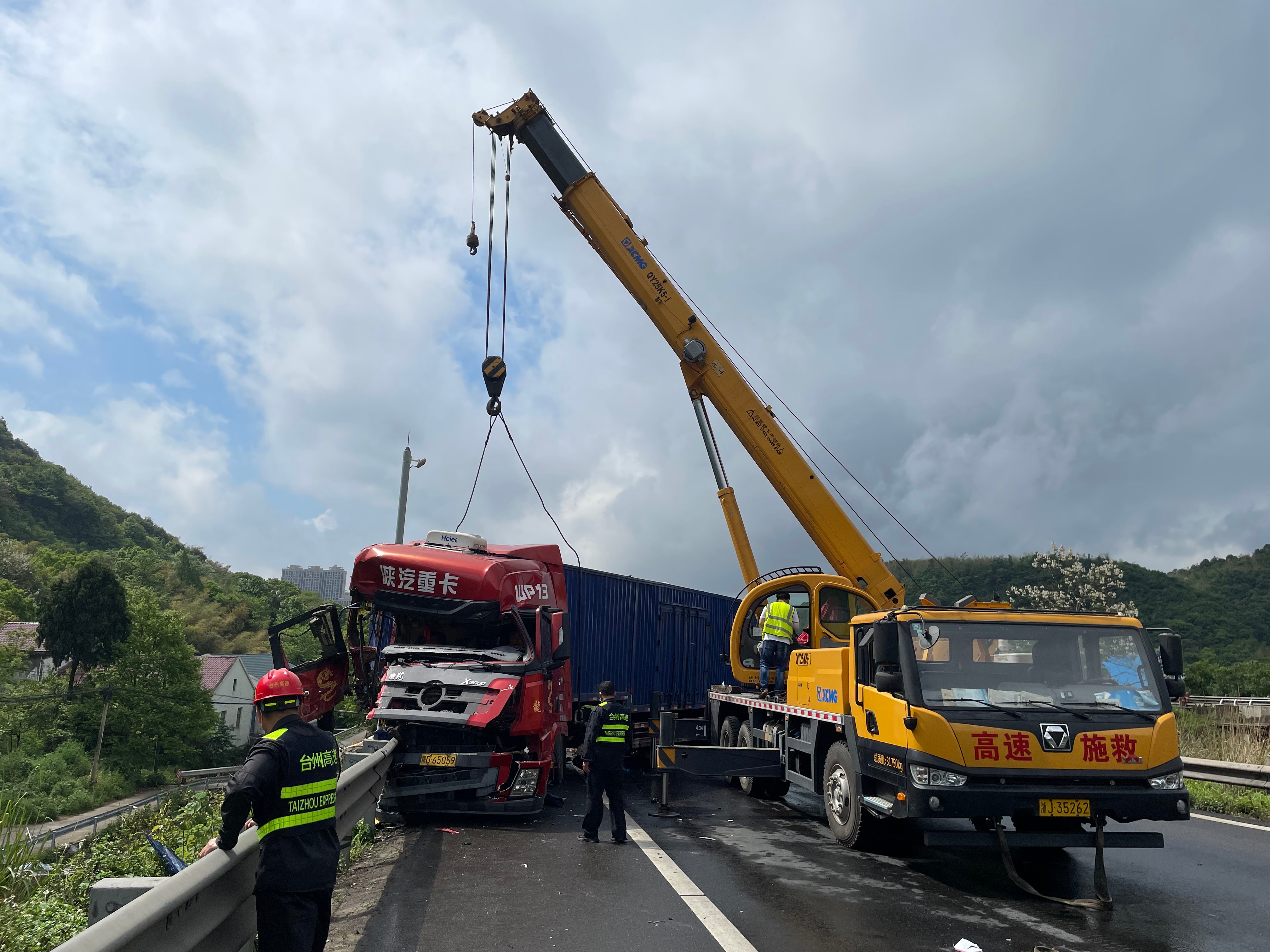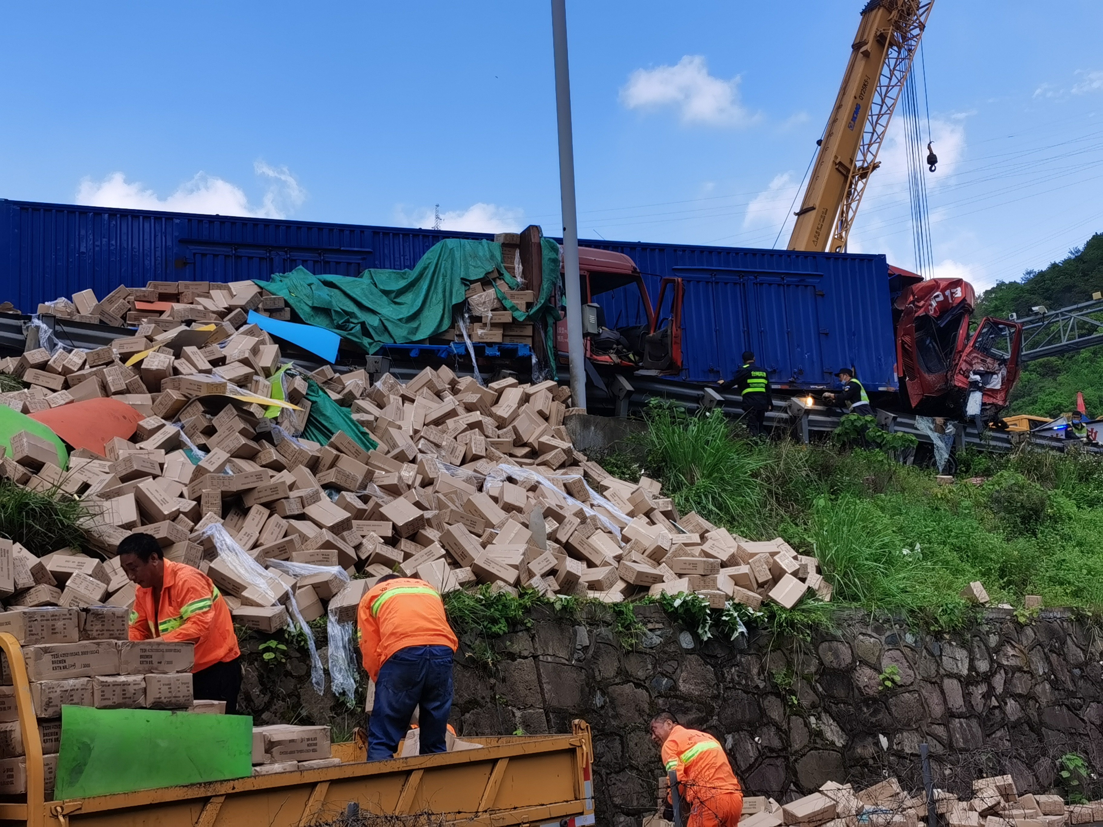 聽到巨響的黃土嶺隧道所工作人員立刻提高警惕,啟動應急預案,所負責人應錦清帶領執(zhí)勤隊員迅速出動到達事故現場,執(zhí)勤隊員第一時間在事故車后方預警,以防二次事故。因大貨車車身橫在路面,可通行的道路僅留2米多寬,周圍一下子便開始擁堵。執(zhí)勤隊、施救人員聯(lián)合高速交警指揮交通,讓后方無法通行的貨車暫時排在一側,保證后續(xù)救援暢通。