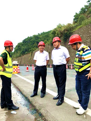 圖為市公路局局長(zhǎng)馬德勝在集團(tuán)總經(jīng)理張建平陪同下踏看現(xiàn)場(chǎng)