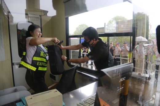隨后,多名參演員工冒雨模擬收費(fèi)崗?fù)ず土嘘?duì)下崗遭遇“歹徒”搶劫的情景開展防盜搶演練?,F(xiàn)場,2名蒙面歹徒執(zhí)仿真刀、軟棍威脅收費(fèi)員交出現(xiàn)金,危機(jī)之中,收費(fèi)站立即啟動(dòng)應(yīng)急處置預(yù)案并報(bào)警求助,收費(fèi)員有效與歹徒周旋,應(yīng)急處置組人員迅速攜鋼叉、橡膠棒、勞動(dòng)工具等赴現(xiàn)場支援,值班領(lǐng)導(dǎo)、收費(fèi)班長、監(jiān)控員合力協(xié)作應(yīng)對(duì)歹徒,防盜搶演練順利結(jié)束。