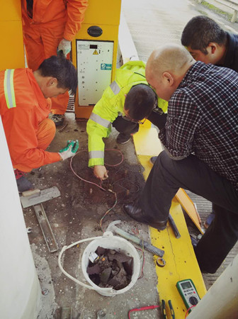 圖為工作人員對新欄桿機進行接線