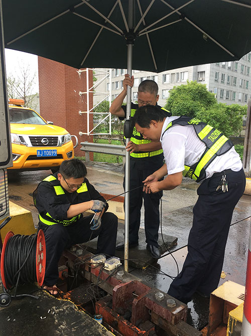 可是天公不作美,經過一夜,雨還持續飄落著,收費站出口車輛逐漸增多,再不檢修將會導致其他車道通行壓力越來越大,可是如果冒雨檢修則有損壞設備的風險。正在兩難之際,中心負責人葉俊向兄弟單位借來了一頂大型遮陽傘,在大傘遮擋下,搶修小組不顧前晚疲憊,對稱臺的4組傳感器用萬用表進行了一一檢測,結果顯示也全部正常。 “可為何組合起來傳輸到處理器上的時候計重數據就不正常了呢,難道問題出在這根數據線上?”順著這個思路,搶修人員慢慢地將這根線從線井中拉出,果不其然,在線的中間位置發現了被老鼠咬破的裂痕。為使數據傳輸更加穩定可靠,搶修人員采用了整體更換方式,重新穿線再將兩頭的接點用電烙鐵進行焊接,經過一個多小時地奮力搶修,稱臺故障終于排除,該車道也恢復正常通行。此時,搶修人員后背濕透,分不清是汗水還是雨水……