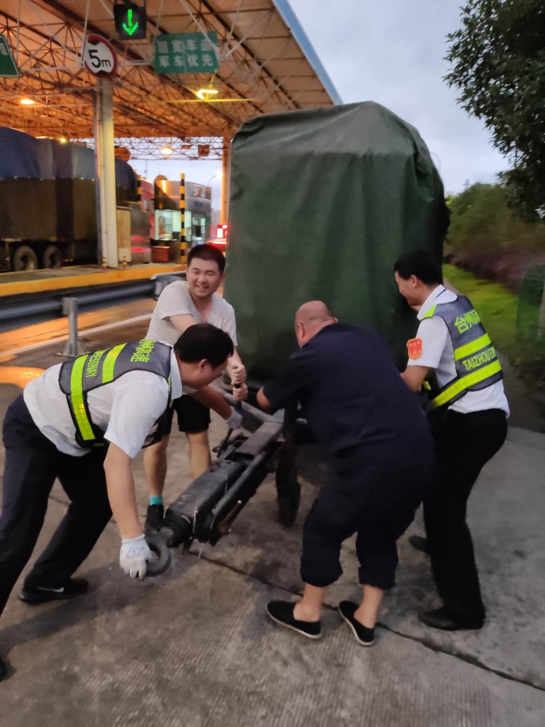 因故障涉及外網(wǎng)高壓供配電,維養(yǎng)中心緊急啟動應(yīng)急預(yù)案,一邊聯(lián)系黃巖供電部門將10KV高壓進(jìn)線斷開,以確保搶修人員人身安全,一邊求助施救中心將停在臺州所的移動發(fā)電機(jī)拉至臺州南收費(fèi)所。但由于該站站房轉(zhuǎn)角偏小,拖車無法進(jìn)入,大家便一起合力將重達(dá)十幾噸發(fā)電機(jī)手推至配電房外側(cè),以備不時之需。