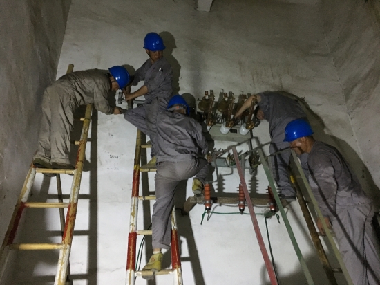 19點(diǎn)40分,高壓負(fù)荷開關(guān)到位。搶修人員安照各自的分工,掛接地電阻、拆卸舊件、重做高壓電纜接頭、安裝新跌落熔絲......就在大家以為快要完工時,卻發(fā)現(xiàn)新開關(guān)的聯(lián)動拉桿接口要略大于舊桿,任憑搶修人員如何用力都無法與底下操作桿連接,但大家并沒有放棄,而是用磨光機(jī)一點(diǎn)點(diǎn)打磨,一次次試驗(yàn),在損耗了兩張磨光片后終于將兩桿順利連接。之后,大家再一鼓作氣,將調(diào)試好的負(fù)荷開關(guān)固定在離地面3米之高的墻上,并成功連接電纜。