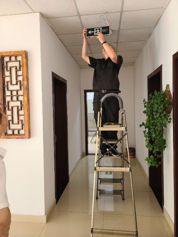 圖為技術人員安裝現(xiàn)場 在得知這一情況后,維養(yǎng)中心積極協(xié)助收費站所購買相關的主材及配件,并主動承擔了這些設備安裝工作。由于設備安裝位置很多沒有直接可用電源,中心技術員們就從四五米外甚至更遠的地方,一路套管放線過來取電,并用電錘等工具為其開孔固定,最后再完成接線送電。經過2天努力,這些帶有方向提示標識、安全出口標識的燈牌被安裝在各層樓梯出口、拐角或主要通道上,因全部帶有儲電功能,即便在斷電的情況下也能發(fā)光發(fā)亮。