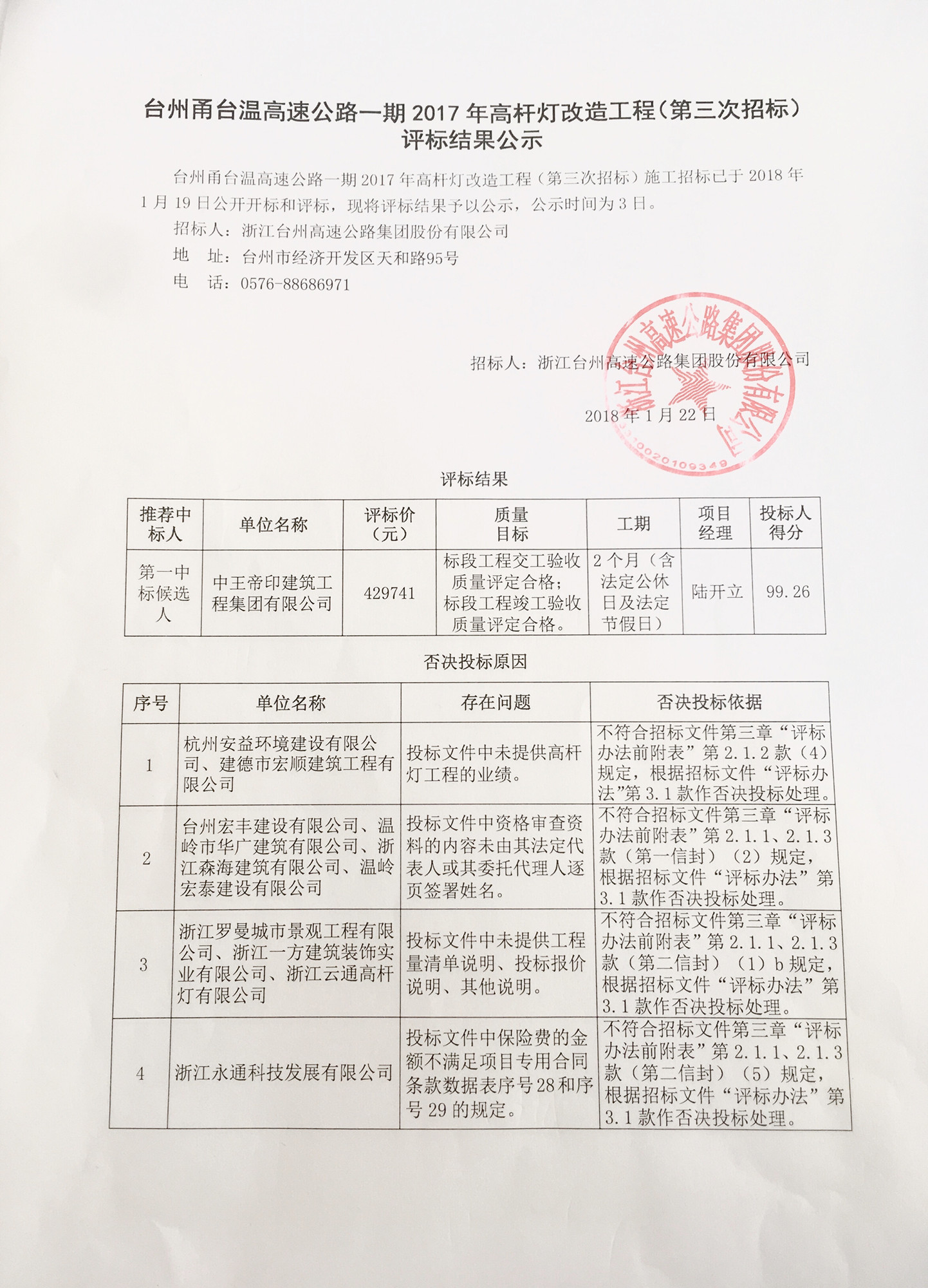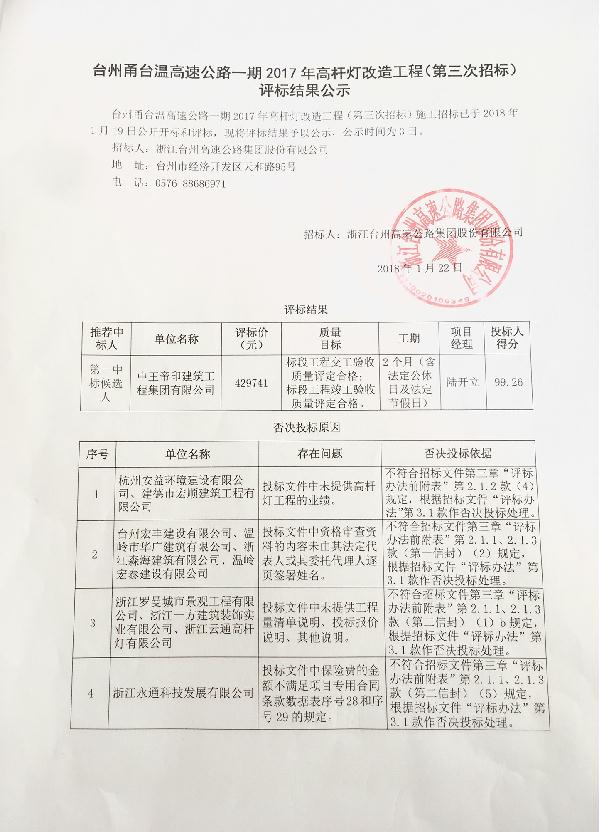 臺(tái)州甬臺(tái)溫高速公路一期2017年高桿燈改造工程(第三次招標(biāo))評標(biāo)結(jié)果公示