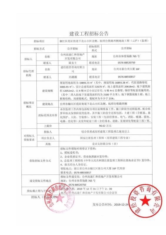 椒江區(qū)葭沚街道下北山小區(qū)北側(cè)、杭紹臺鐵路西側(cè)地塊工程(云廬)招標公告