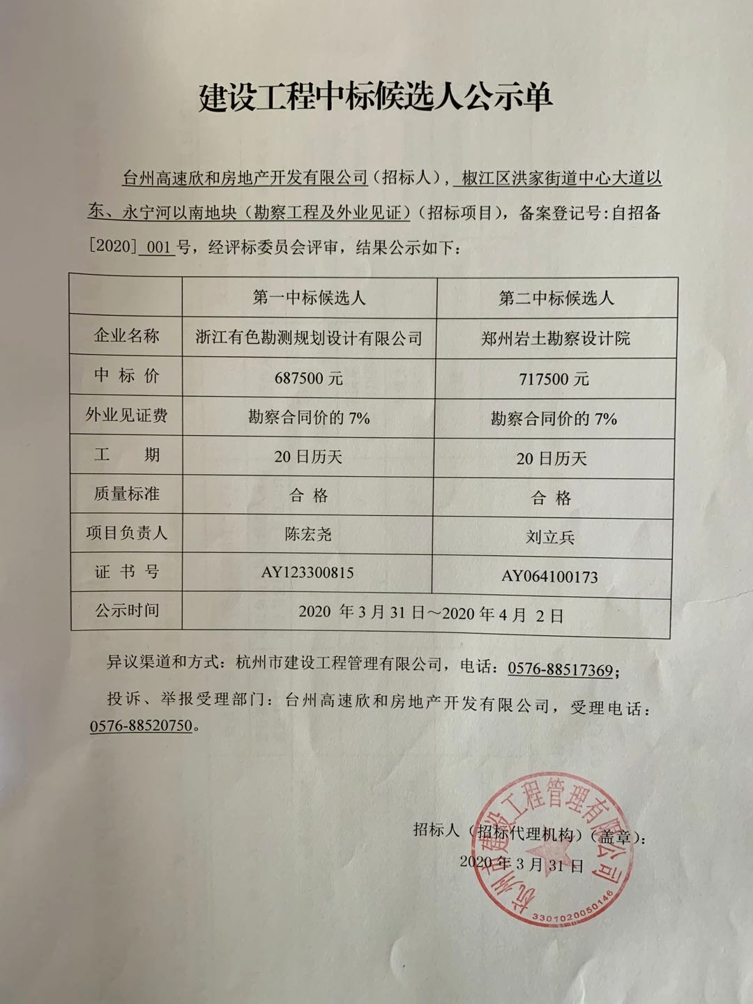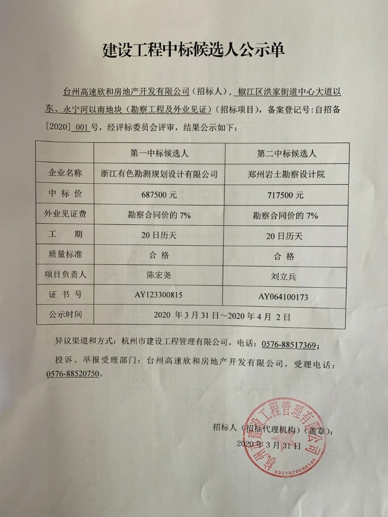 椒江區洪家街道中心大道以東、永寧河以南地塊(勘察工程及外業見證)(招標項目)中標候選人公示單