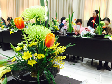 圖為公司女員工在現(xiàn)場插花